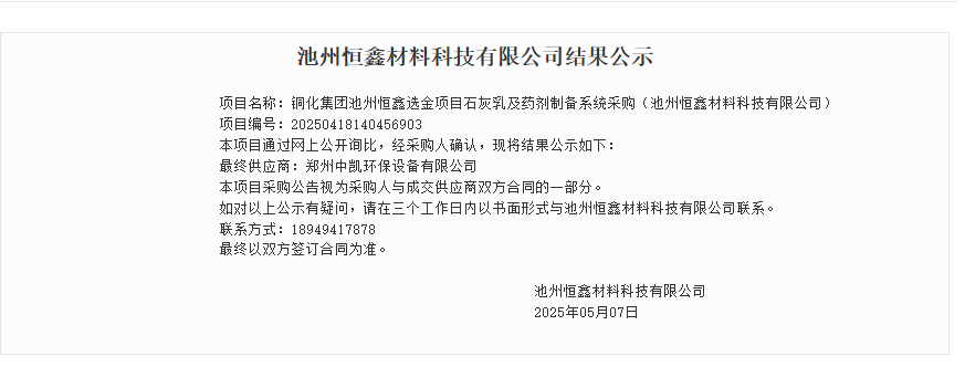 喜報 + 1!感謝 [池州恒鑫] 的再次選擇,我司成功中標 池州恒鑫材料科技有限公司[石灰乳及藥劑制備系統采購項目]和[稱重螺旋給料器采購項目]!基于過往的成功合作,這次我們更懂需求、更有底氣,定不負期待!